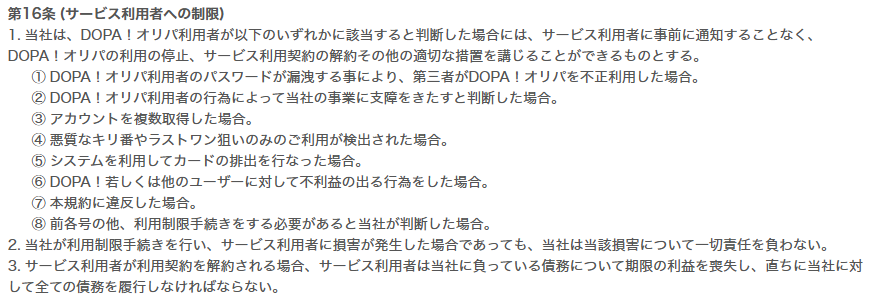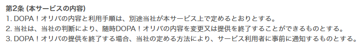DOPAの利用規約上では、クーポンコードを含めたDOPAのサービス内容は変更、または終了を自社判断で行えます。