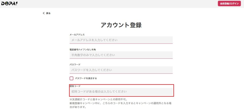 DOPAでは招待コードが新規会員登録時、それ以外のクーポンコードが会員登録後に使用できます。