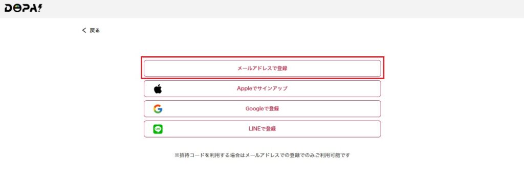 新規会員登録時に入力できるのは招待コードのみであり、招待コードはメールアドレスで登録するときにしか使用できません。