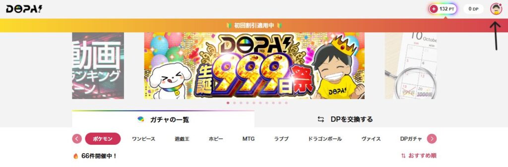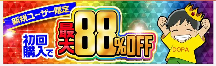 | 初回購入割引 | DOPA公式サイトのPT購入画面で自動適用 | 新規登録者のPT初回購入時に 最大88%割引 |