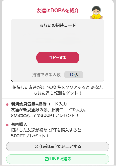新規会員登録の300PTまでは完全無料で入手できるため、DOPAを体験したい人は招待コードの活用がおすすめです。