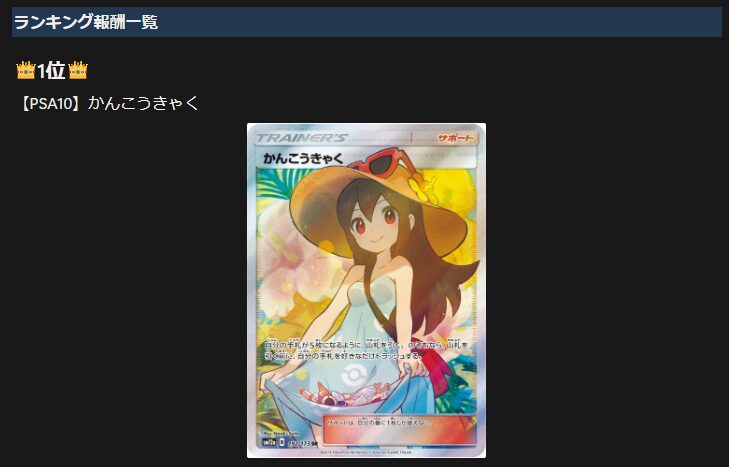 ランキング報酬は開催月によって変更される場合がありますが、基本的にはPSA10鑑定品のポケカが配布されています。