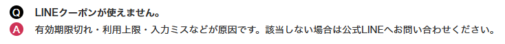 | クーポンを入力できたが 適用されない | 不正利用などにより 利用制限がかけられている |