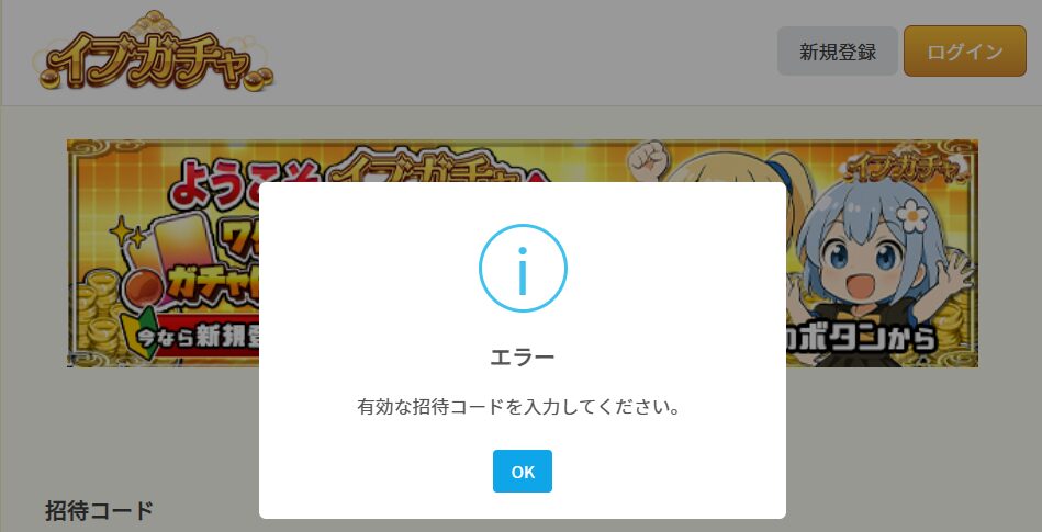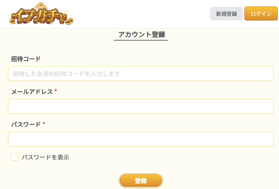イブガチャの新規会員登録時に入力できるのは、招待コードのみです。