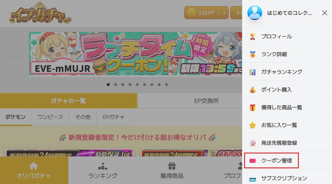イブガチャの会員登録後には、招待コード以外のクーポンコードを入力できる画面があります。