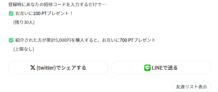 累計5,000円達成時の700PTのほうは人数制限がないため、会員登録後は積極的に自分の招待コードを拡散していきましょう。