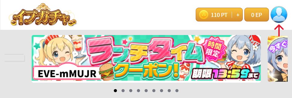 イブガチャにログインすると、トップページの右上に人型のアイコンが表示されます。