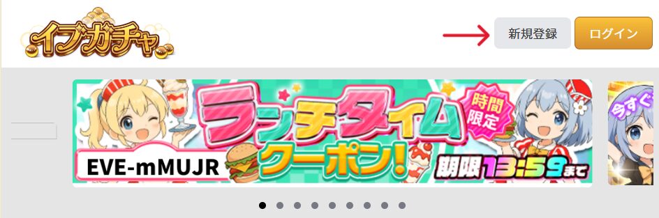 ログイン前のイブガチャのトップページで、右上に表示されている「新規登録」を選択します。