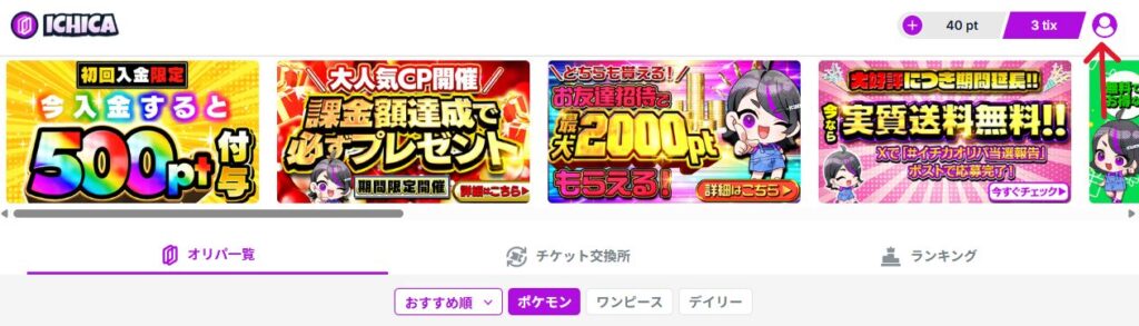 ICHICAオリパにログインすると、画面右上に人型のアイコンが常に表示されています。