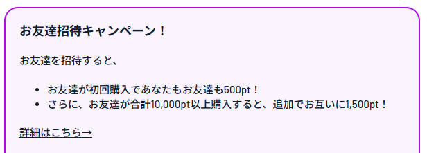 | 特典内容 | ・コード入力画面で招待コードを入力して、ポイントを初回購入すると500pt ・招待コードの入力後に合計10,000pt以上ポイント購入すると追加で1,500pt ・紹介者も会員登録者が条件を達成するたびに同じポイントを付与 |