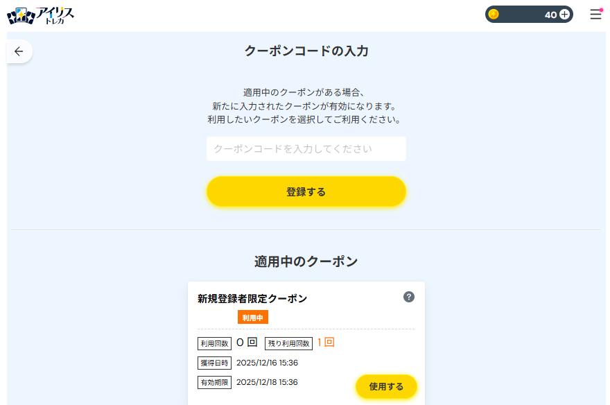 アイリストレカの会員登録した場合、招待コード以外のクーポンコードも入力できます。