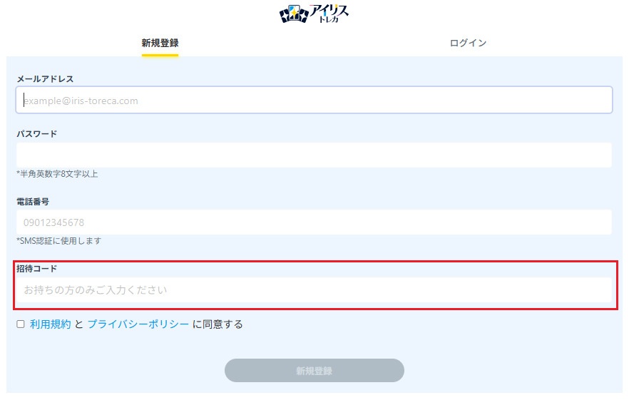 アイリストレカの新規会員登録時に入力できるのは、招待コードのみです。