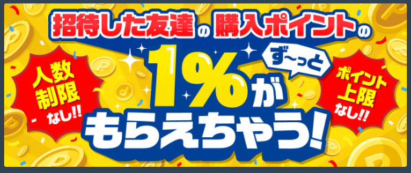| 特典内容 | 招待コードの入力者がポイント購入するたびに、紹介者に購入額の1%分のポイントが付与される |