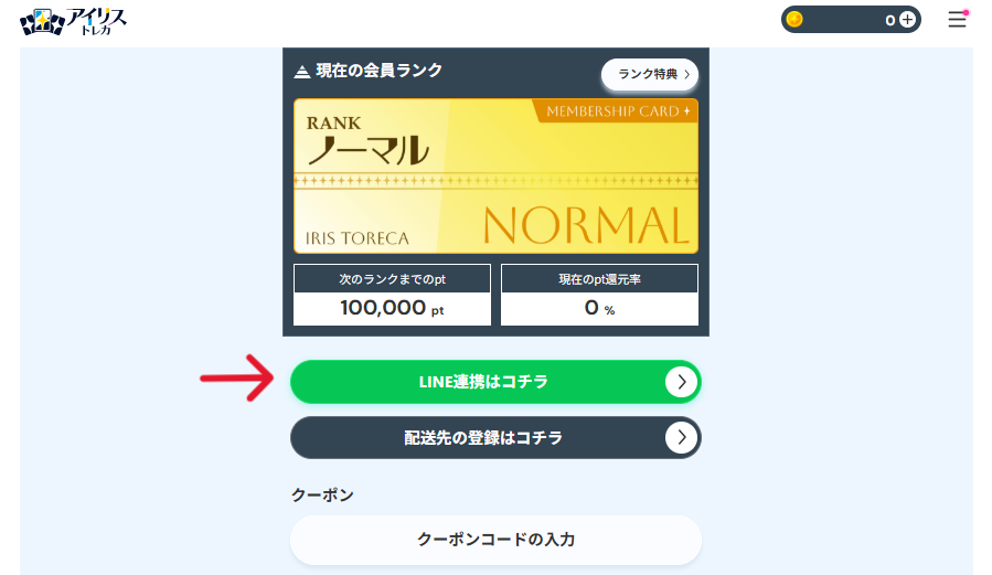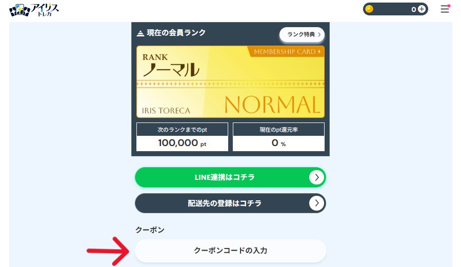 マイページに移動すると、「現在の会員ランク」の下にある「クーポンコードの入力」を選択します。
