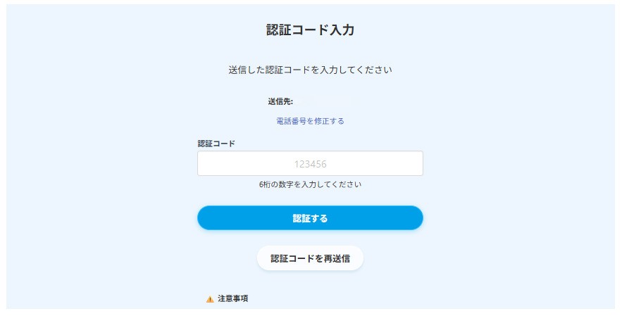 「新規登録」を押すと、入力した電話番号のSMSに認証コードが送信されます。