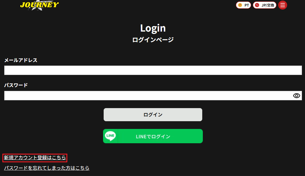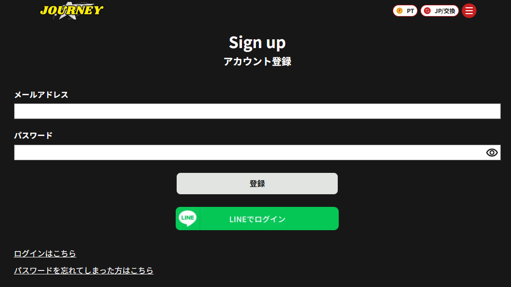 ジャーニーガチャの新規会員登録では、メールアドレスによる登録か、LINEアカウントを利用した登録を選べます。