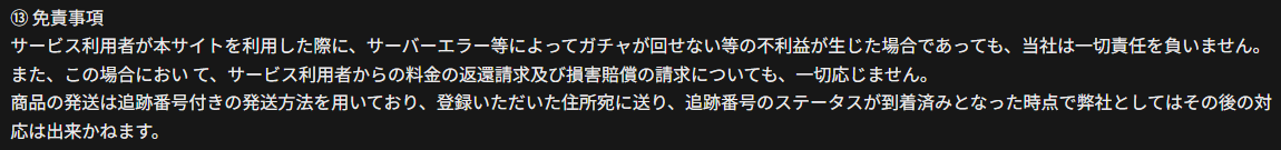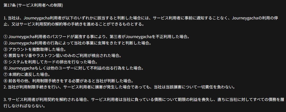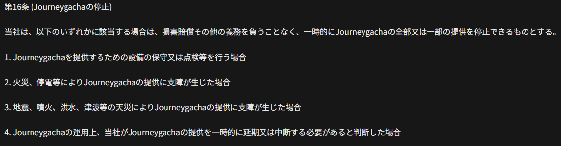 ジャーニーガチャは保守点検や不具合の発生時に、サービスの一部、または全部を停止できると利用規約上に明記しています。