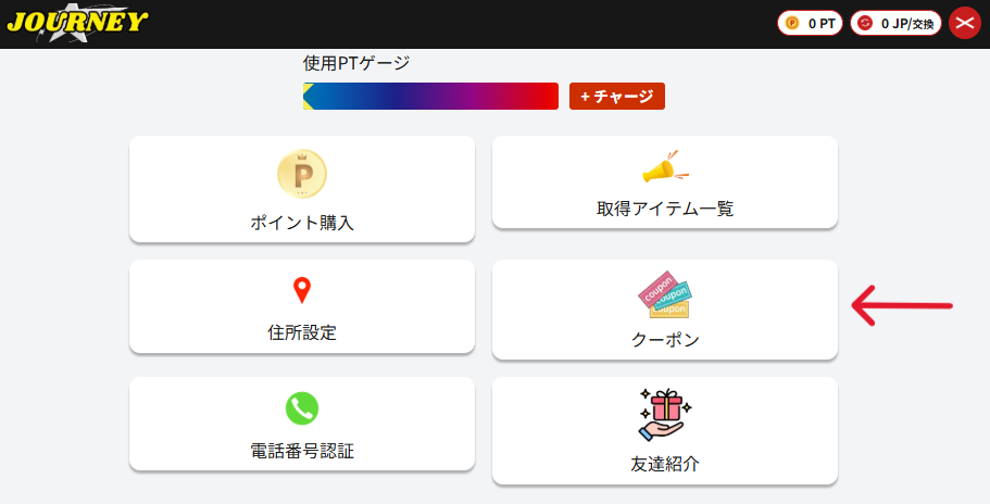 ジャーニーガチャで招待コード以外のクーポンコードは、「クーポン」の項目から入力します。