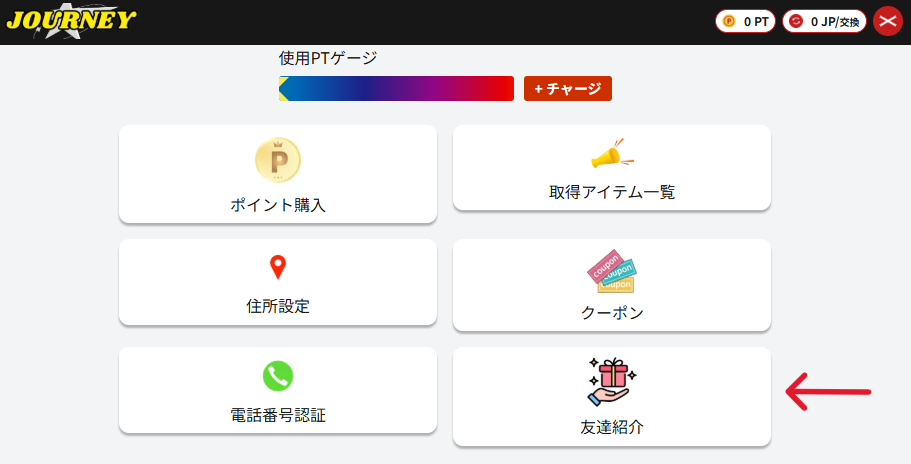 ジャーニーガチャの招待コードの入力は、招待コード全般を管理する「友達紹介」の項目で行えます。