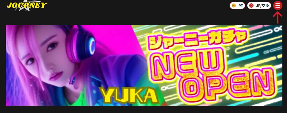 ジャーニーガチャにログインした状態で、トップページ右上の三本線を押して、メニューを表示しましょう。