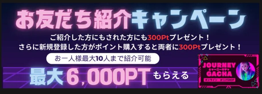 ジャーニーガチャでは会員登録後に利用できる招待コードを用意しており、入力者と紹介者が同じ条件でポイントを入手できます。
