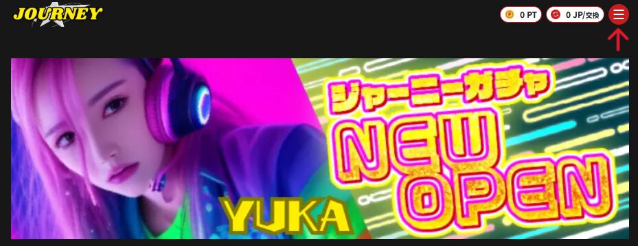 ジャーニーガチャのトップページから、画面右上の三本線を選択して、メニューを表示しましょう。