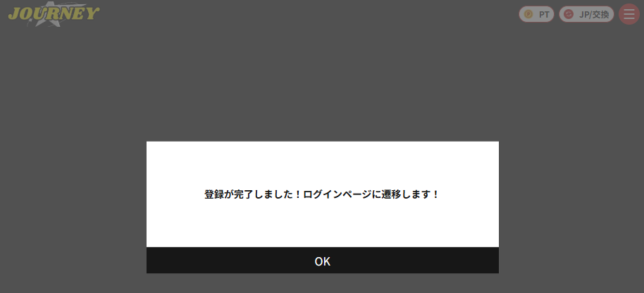 認証コードが正しく入力された場合、登録完了のホップアップが表示されて、ログイン画面に移動します。