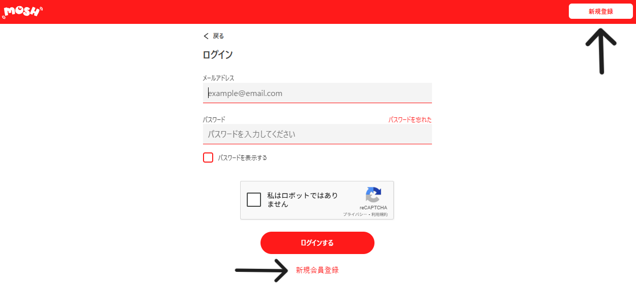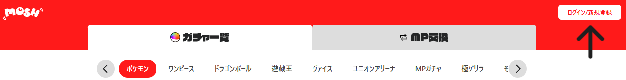 会員登録前にMoshオリパのトップページへアクセスすると、右上に「ログイン/新規登録」が表示されています。
