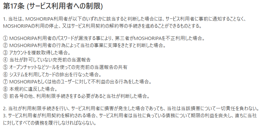 Moshオリパでは不正利用やアカウントの複数所持などの規約違反に該当した場合、事前告知なしで利用制限や解約の措置が取られます。