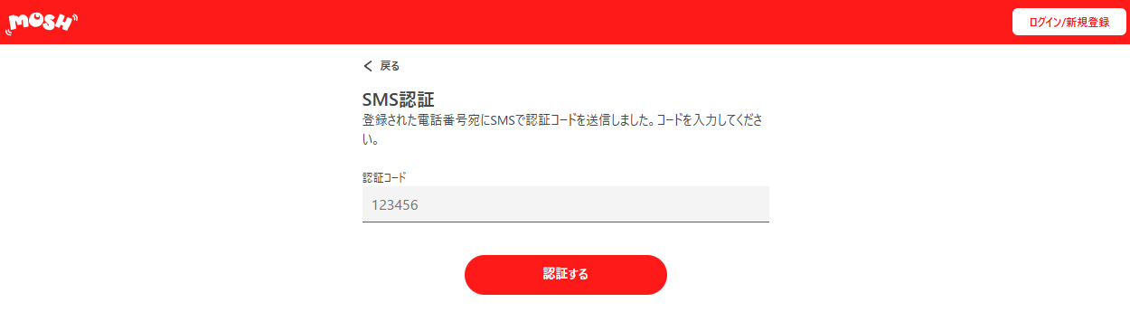 SMS認証画面に移行後、自身のスマホのSMSに認証コードが送信されます。