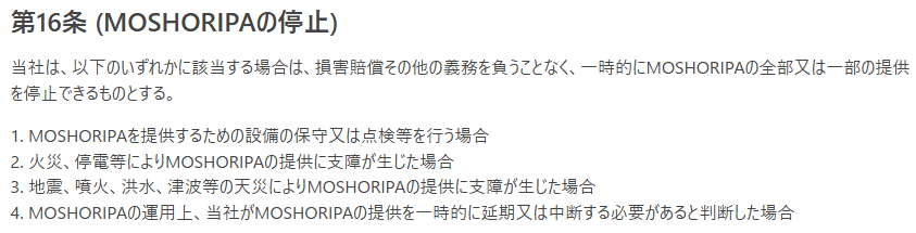 Moshオリパではサービスの保守点検や不具合が発生した際に、サービスの全部または一部を停止できると利用規約に記載しています。