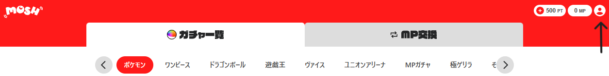 Moshオリパにログインした状態でトップページにアクセスすると、画面右上に人型のアイコンが表示されています。