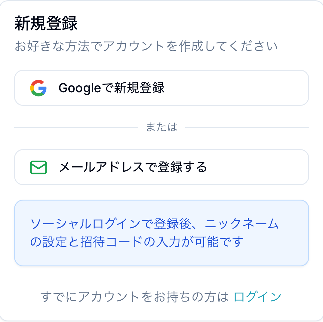 メールアドレス、ニックネーム、パスワード、招待コードを入力して、「登録する」をクリックしましょう。