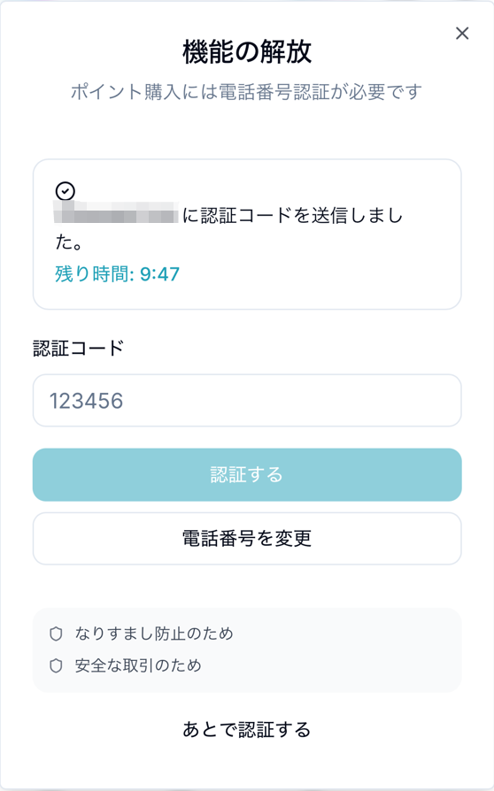 電話番号を登録して届いた6桁の数字を入力して、SMS認証を済ませましょう。