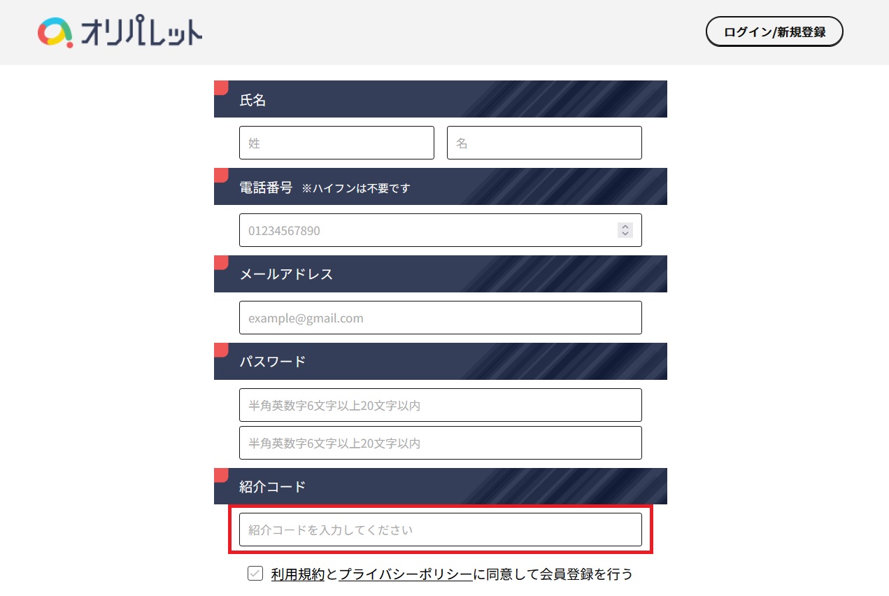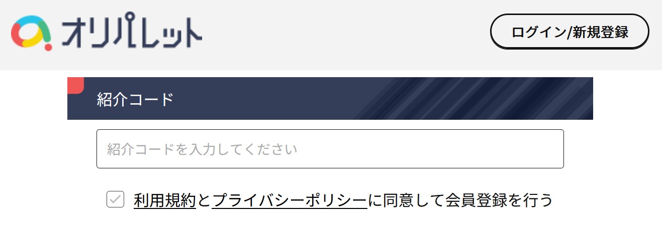 オリパレットでは、会員登録時に「紹介コード」を入力することで、特典を受けられる仕組みがあります。