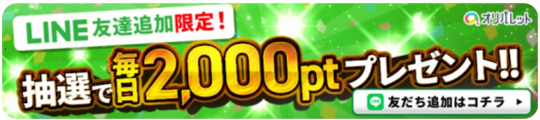 | 公式LINE クーポン | オリパレット公式LINEの友達登録 抽選で毎日2,000ptゲットのチャンス |