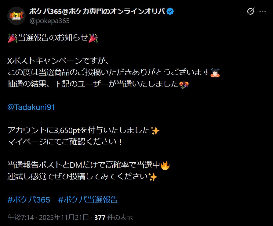 ポケパ365では、当選したカードが自宅に届いた際に画像をつけてXで当選報告するだけで、必ず365ポイントゲットできます。