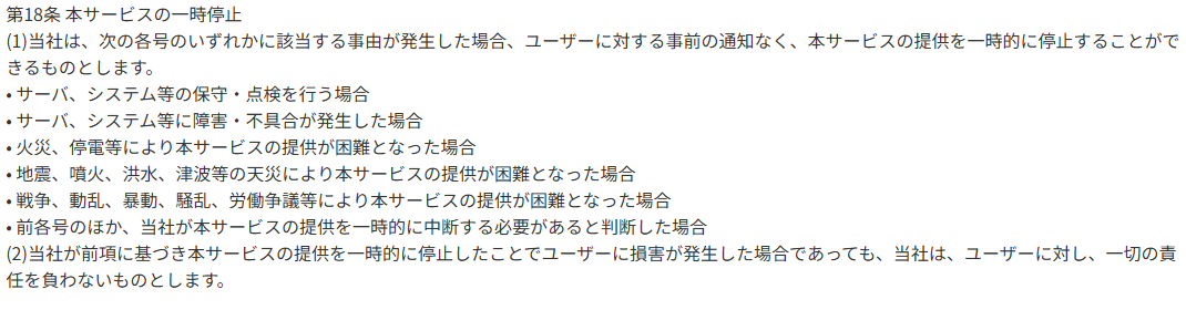 シャイニートレカでは利用規約において、事前通知なしでサービスの一時停止が可能であると記載しています。