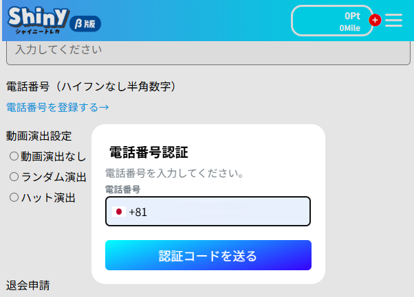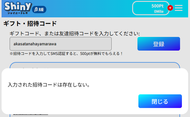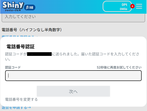 招待コードではSMS認証が必須であり、コードを入力自体は成功しても、SMS認証が完了するまでは特典が付与されません。