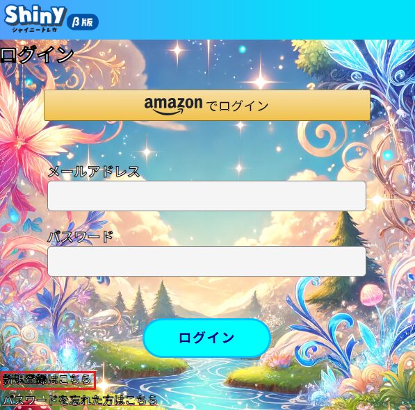 背景の画像で文字が見づらくなっていますが、ログイン画面の左下に「新規登録はこちら」が表示されています。
