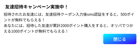 | 入手方法 | 入力者:会員登録時or登録後に招待コードを入力しSMS認証を完了 紹介者:招待コードを入力した人が累計で2,000ポイント購入 |