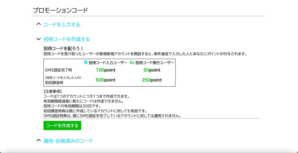 | 特典内容 | ・招待コードの入力者がSMS認証をすると入力者に100pt、発行者に50ptが提供される ・招待コードの入力者が初課金をすると入力者に500pt、発行者に250ptが提供される |