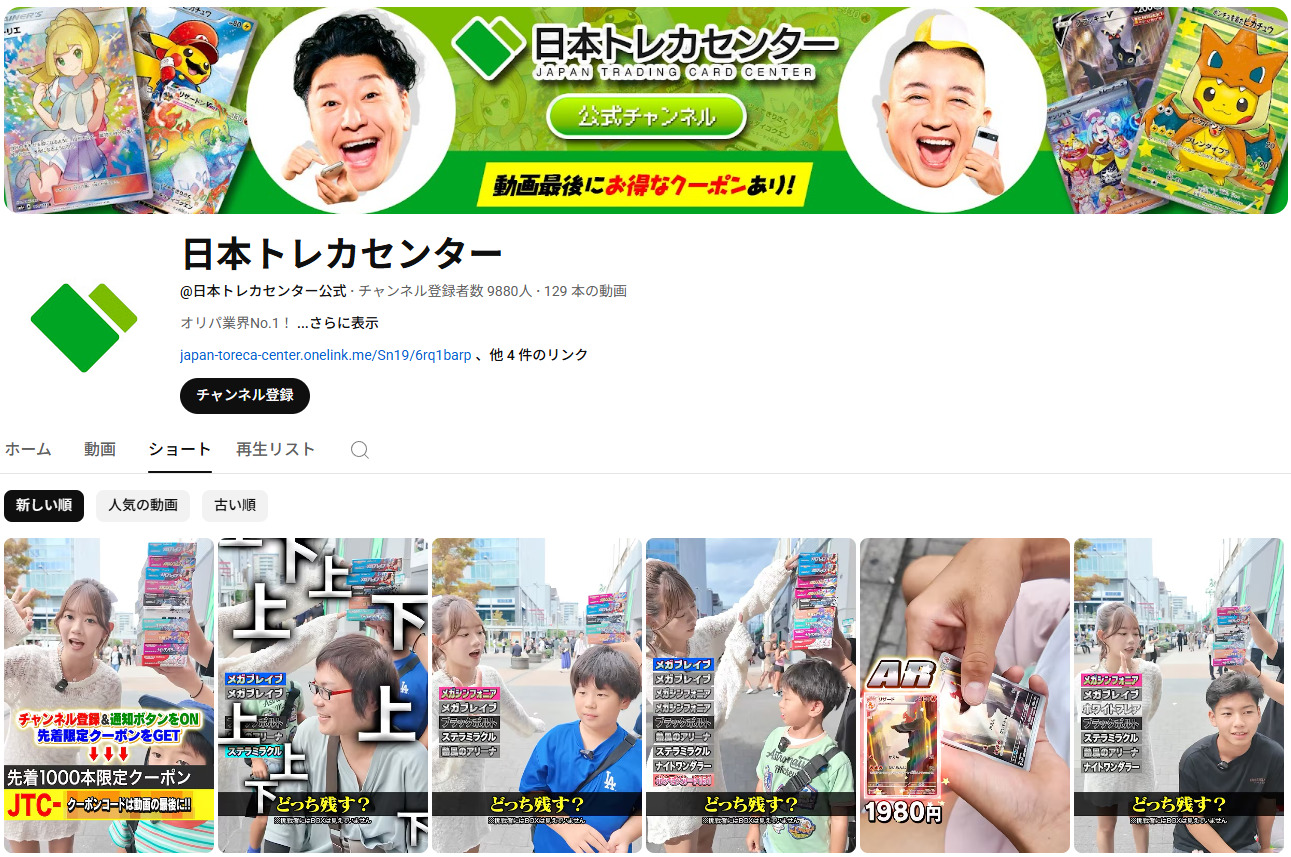 日本トレカセンターは、YouTubeのチャンネルも持っており、ショート動画内で定期的に割引クーポンを配布しています。