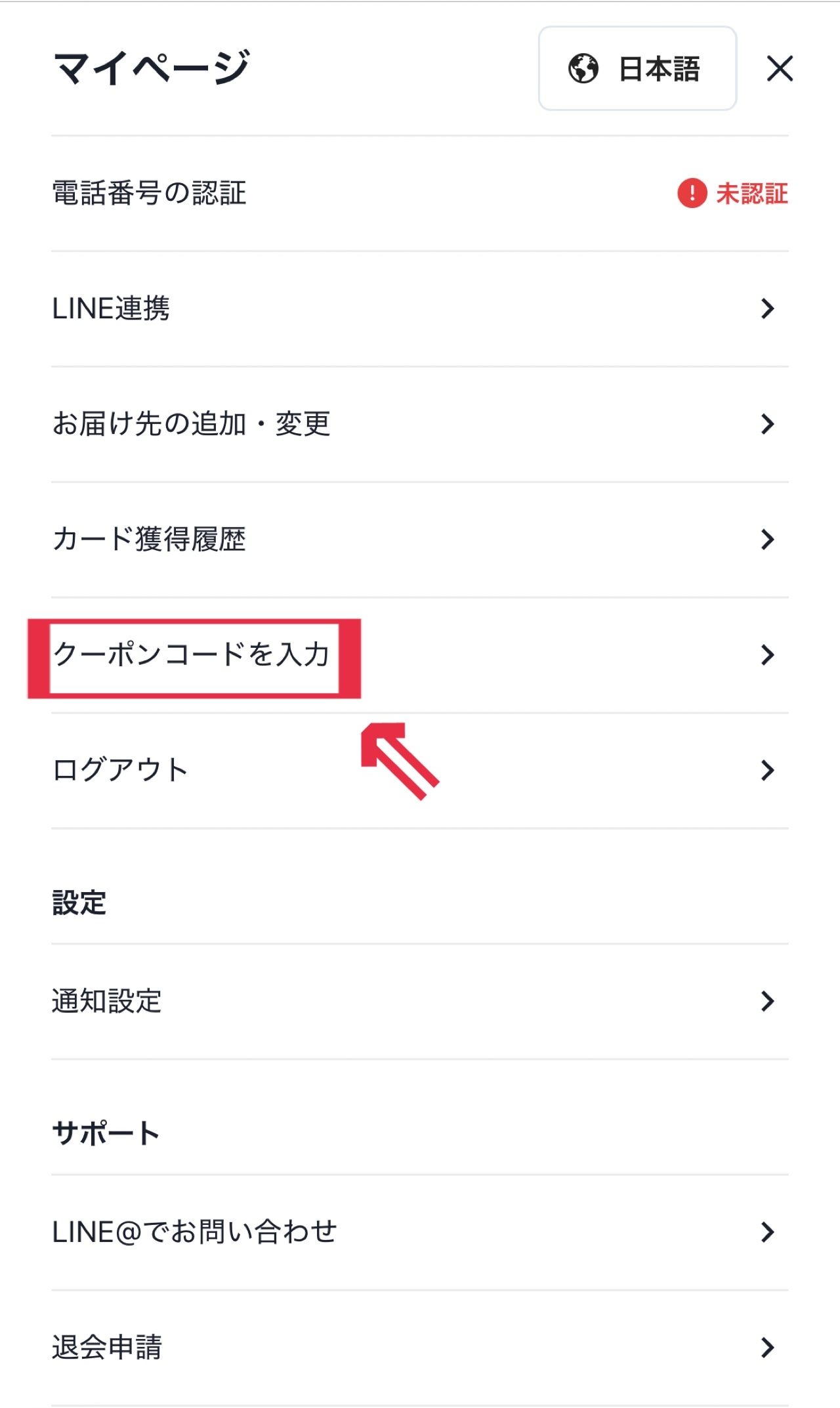 マイページにアクセスしたら、クーポンコードを入力をクリックしてください。