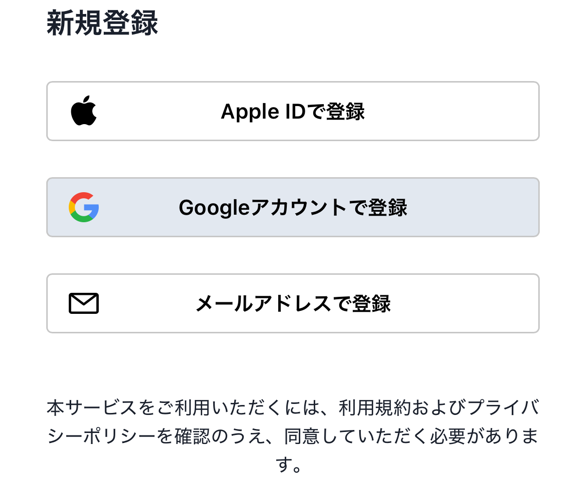 日本トレカセンターでは、AppleIDとGoogleアカウントとメールアドレスの3種類の登録方法が選べます。
